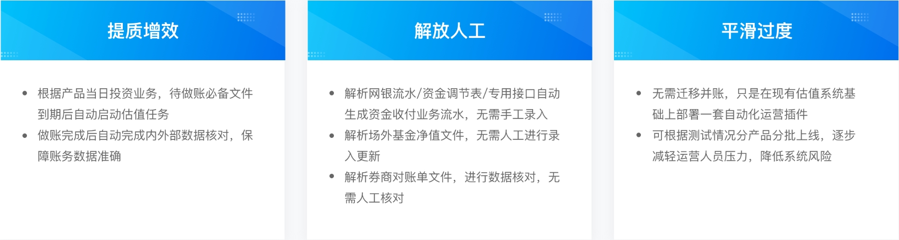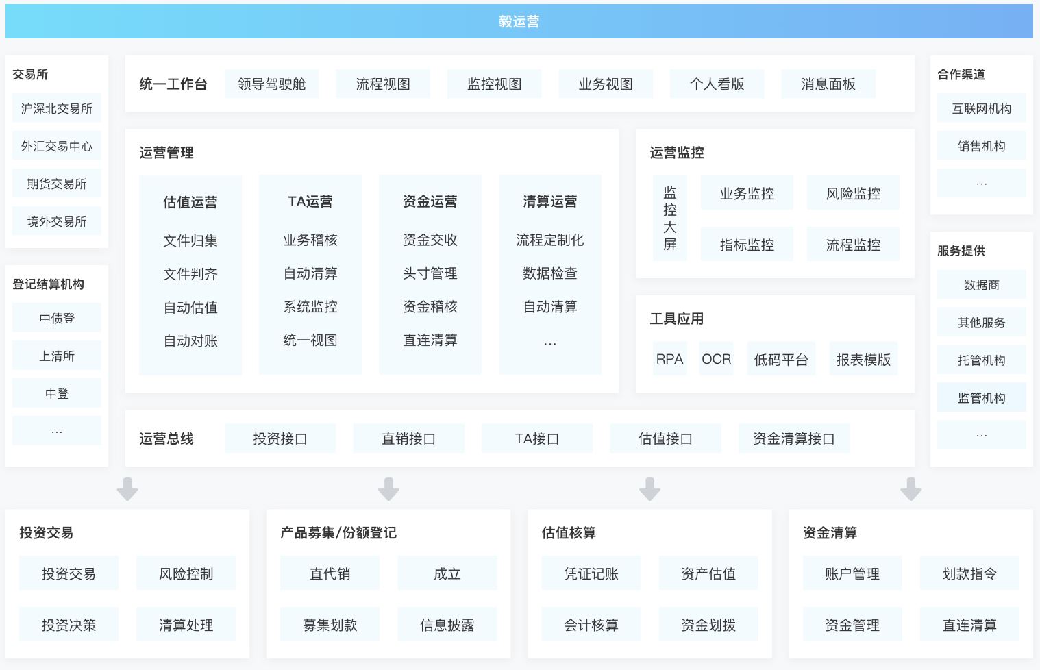 基于多年的行业经验积累和技术实力,云毅网络推出了全新的“毅运营”平台,旨在让运营变得更简单。毅运营打通各核心业务系统,实现投资、估值、TA、资金清算等全方位的运营流程自动化,极大减少和降低人工繁琐机械化的劳动,并在流程中嵌入丰富的业务和风险监控指标与提醒,确保将运营风险降至最低。这样一来,运营人员可以更加专注于那些更具挑战性和高附加值的任务,“早点下班”成为可能。